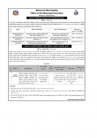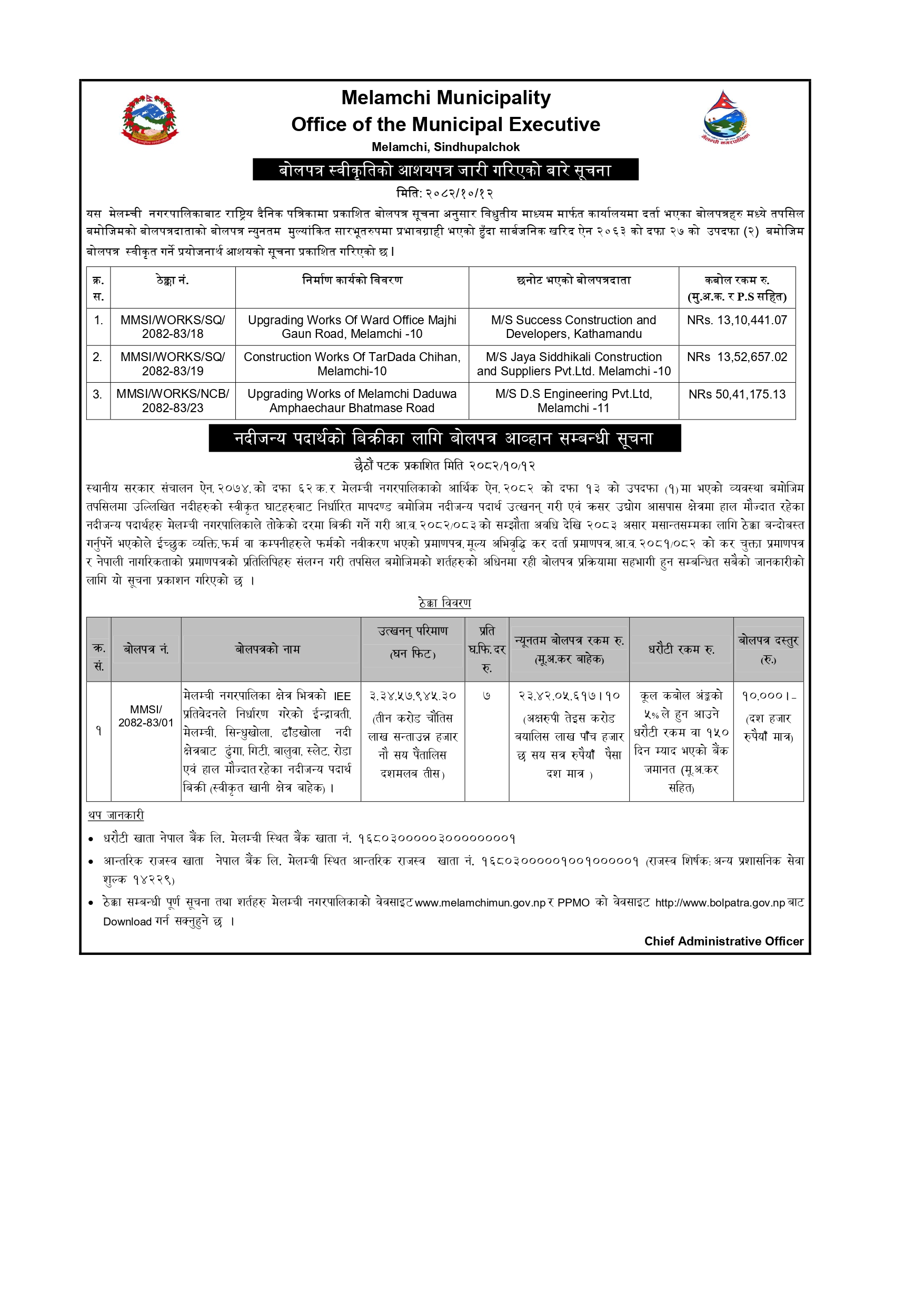 बोलपत्र स्वीकृतिको आशयपत्र जारी गरिएको बारे सूचना र नदीजन्य पदार्थको बिक्रीका लागि बोलपत्र आव्हान सम्बन्धी सूचना