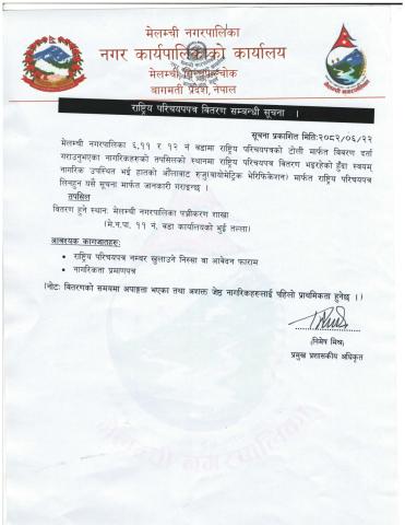 राष्ट्रिय परिचयपत्र वितरण सम्बन्धी सूचना ।