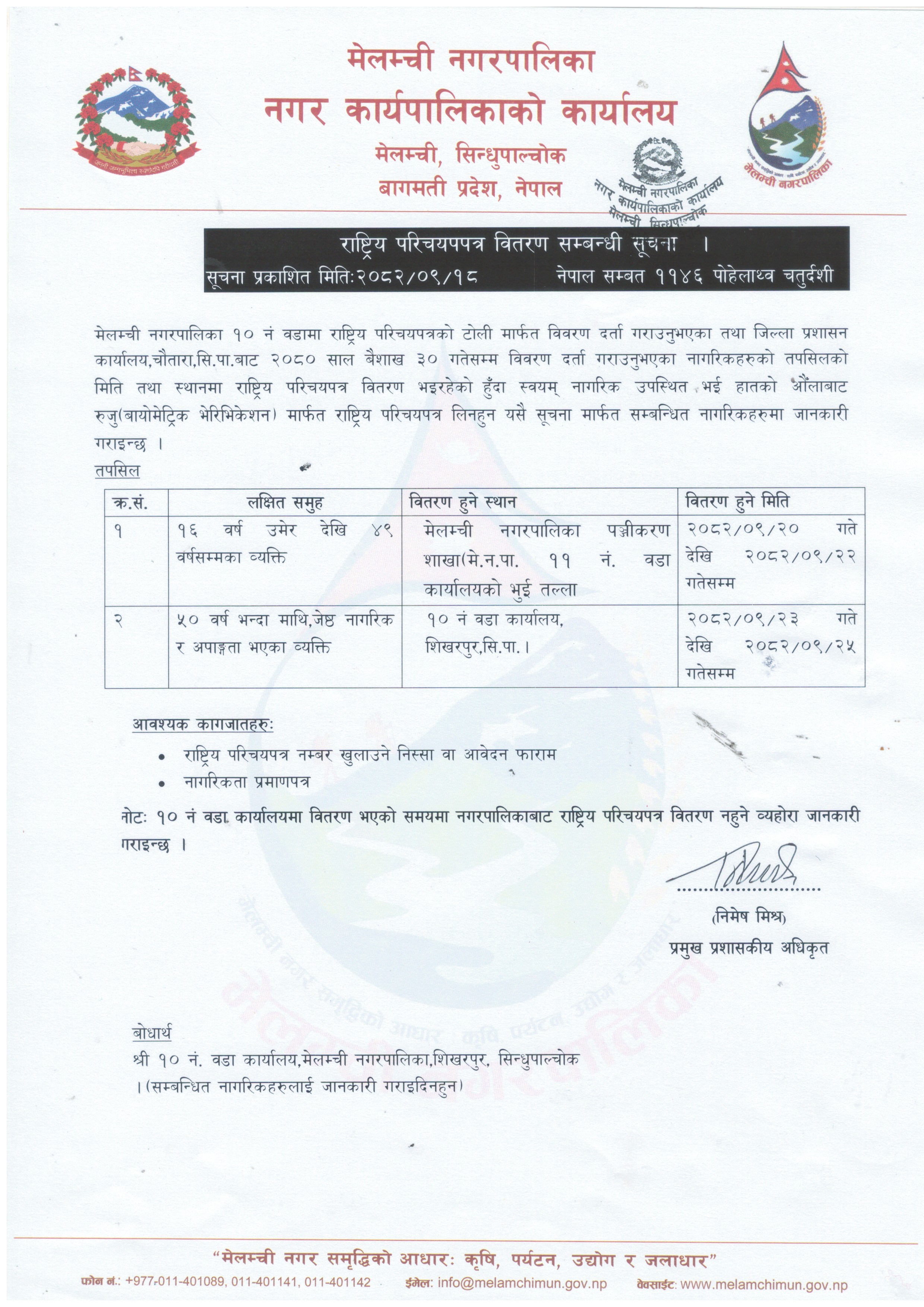 वडा नं १० को राष्ट्रिय परिचयपत्र वितरण सम्बन्धी सूचना