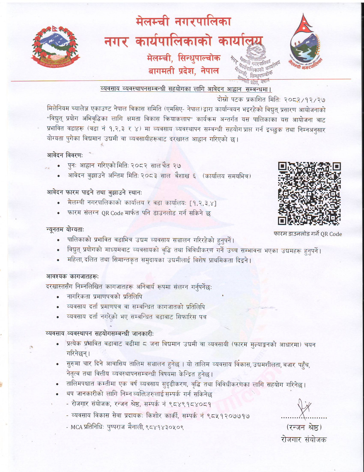 व्यवसाय व्यवस्थापन सम्बन्धी सहयोगका लागि आवेदन आह्वान सम्बन्धमा