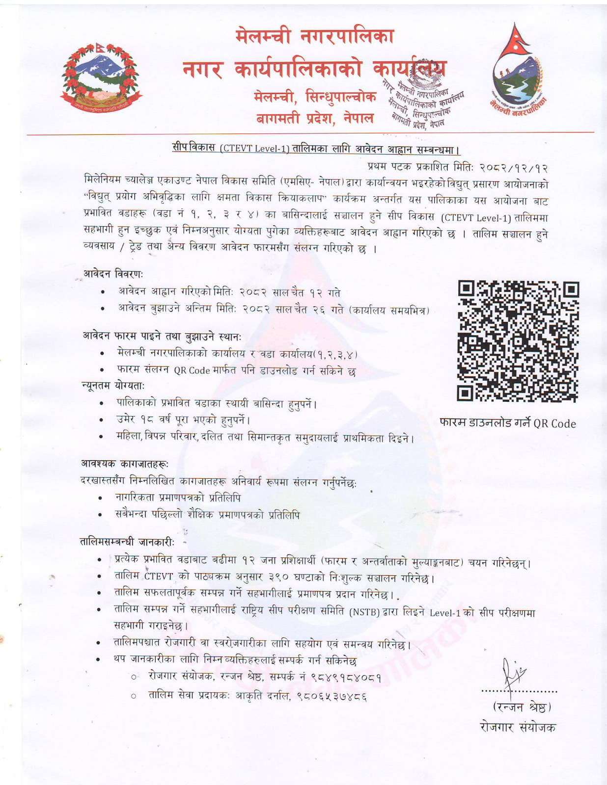 सीप विकास (CTEVT Level-1) तालिमका लागि आवेदन आह्वान सम्बन्धमा ।