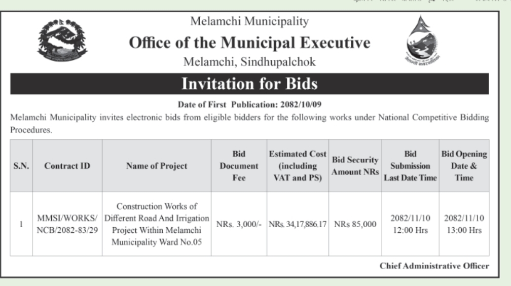 invitation for bids for construction works of different road and irrigation project within melamchi municipality ward no.5