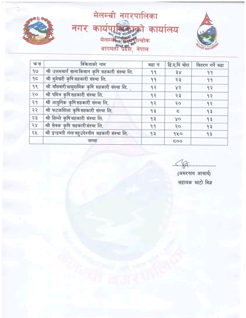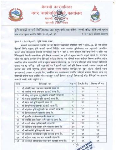 कृषि सामाग्रीबाट प्राप्त अनुदानको मलको कोटा तोकिएको सूचना।