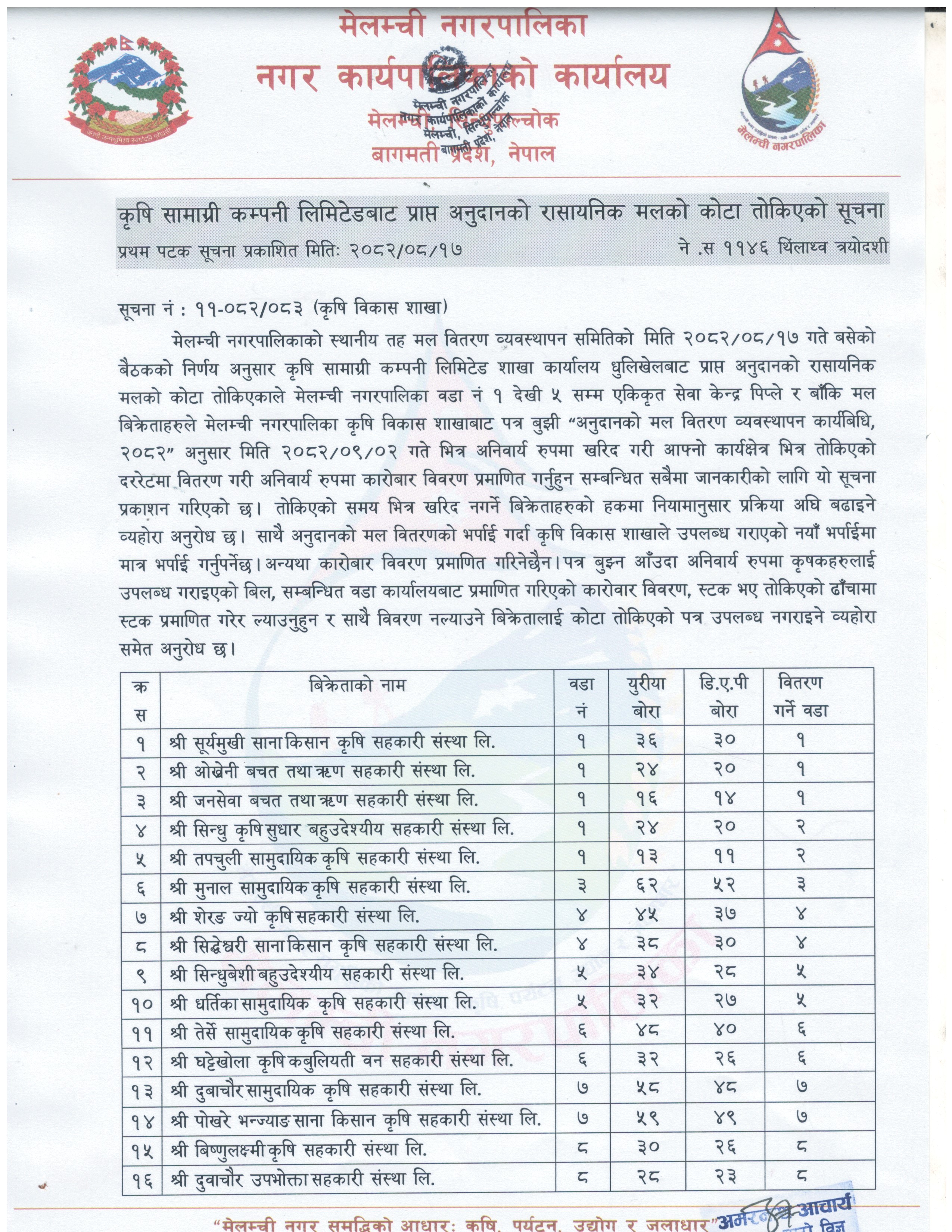 कृषि सामाग्रीबाट प्राप्त अनुदानको मलको कोटा तोकिएको सूचना।
