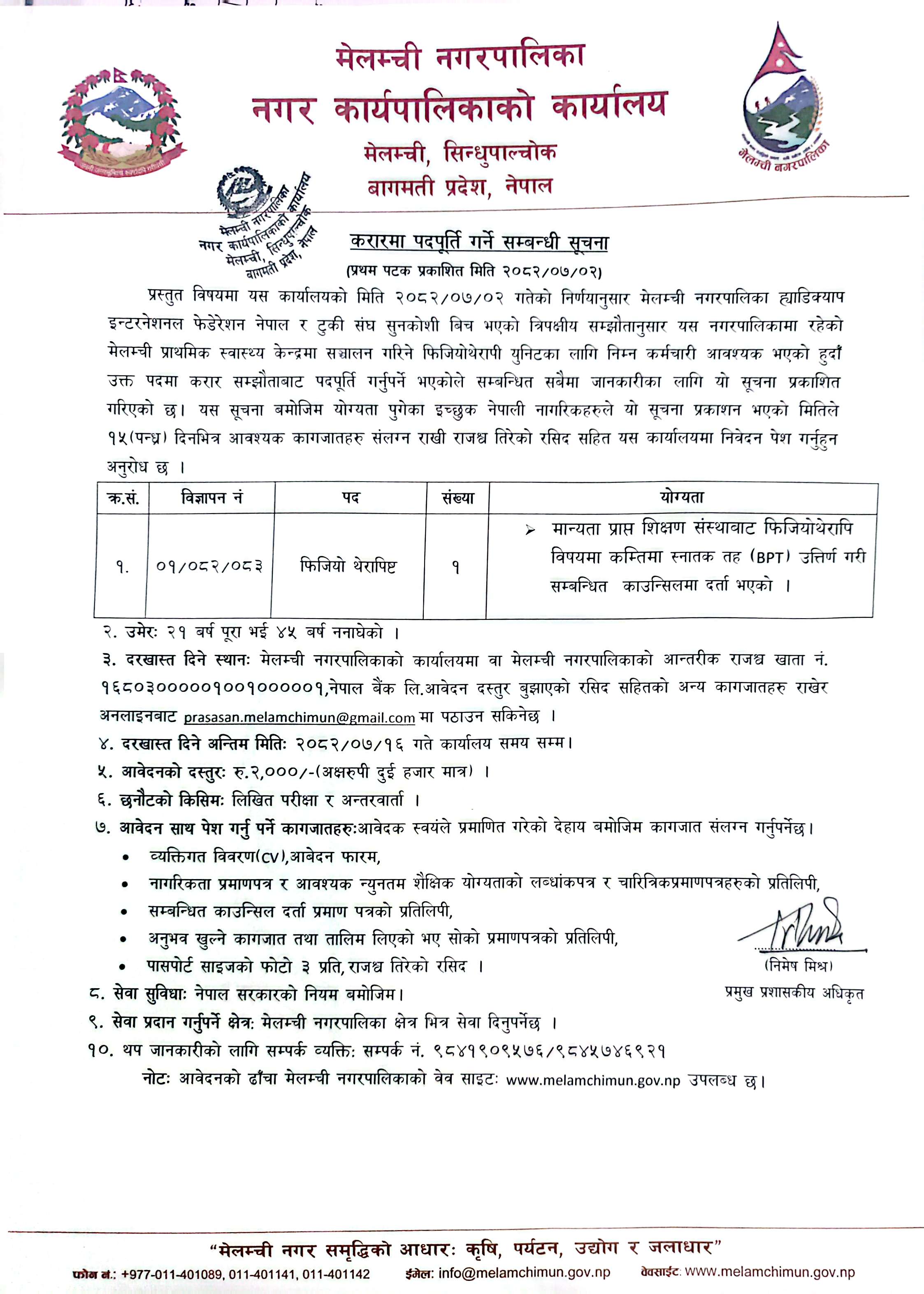 फिजियो थेरापिष्ट करारमा पदपूर्ति सम्बन्धी सूचना