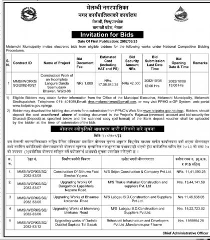 बोलपत्र आव्हान र बोलपत्र स्वीकृतिको आशयपत्र जारी गरिएको बारे सूचना