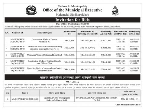 बोलपत्र आव्हान र बोलपत्र स्वीकृतिको आशयपत्र जारी गरिएको बारे सूचना