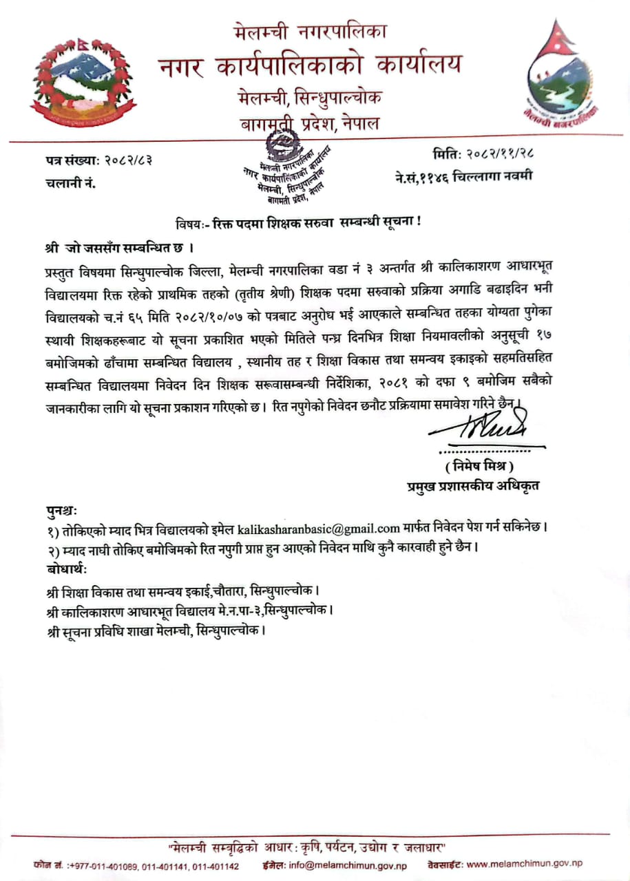 रिक्त पदमा शिक्षक पदपूर्तिका लागि विज्ञापन