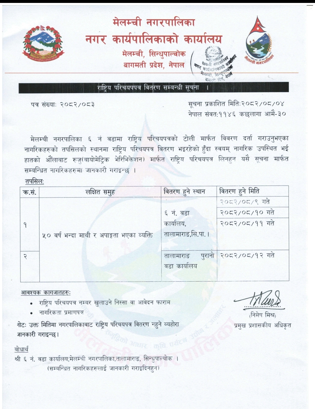वडा नं ६ को राष्ट्रिय परिचयपत्र वितरण सम्बन्धी सूचना