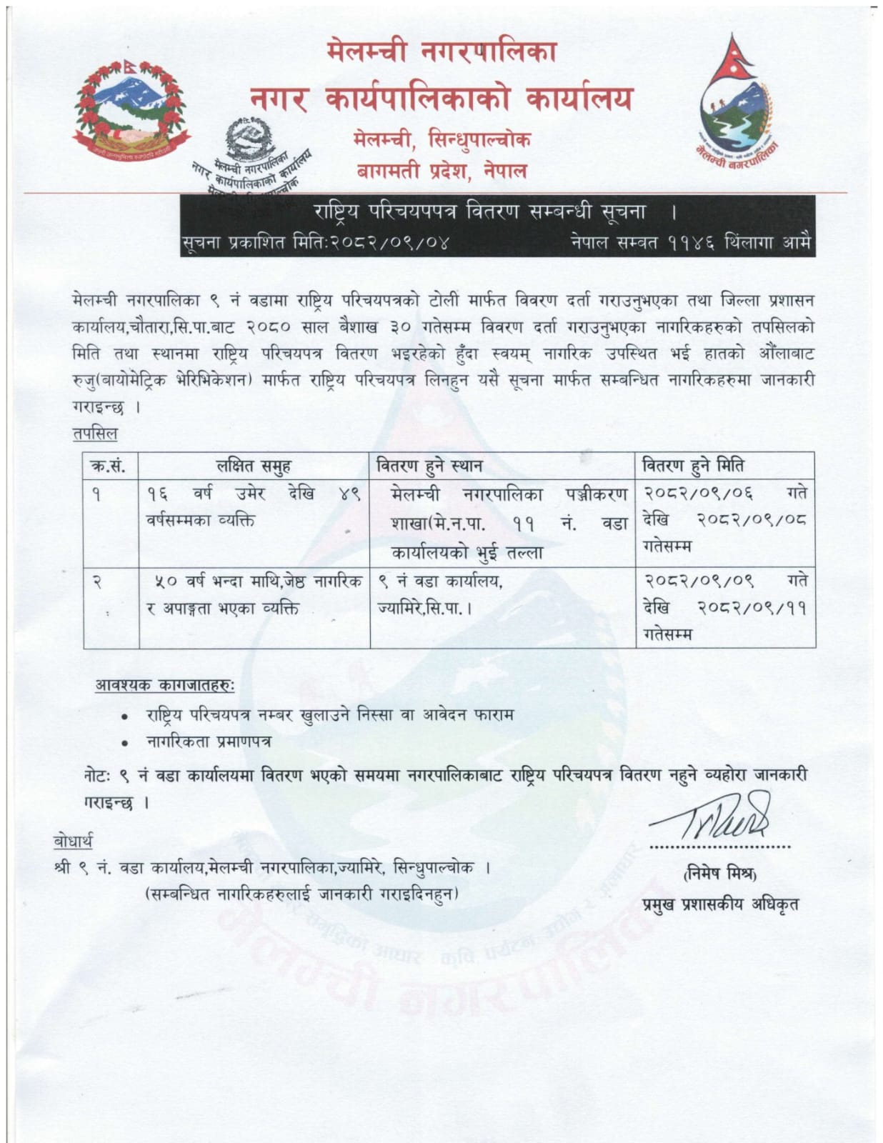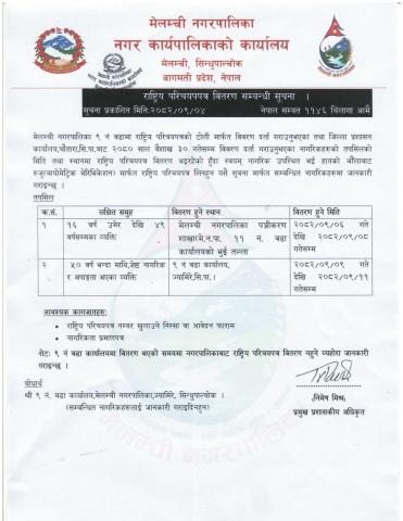 वडा नं ९ को राष्ट्रिय परिचयपत्र वितरण सम्बन्धी सूचना