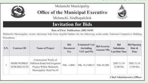 invitation for bids for construction works of different road and irrigation project within melamchi municipality ward no.5