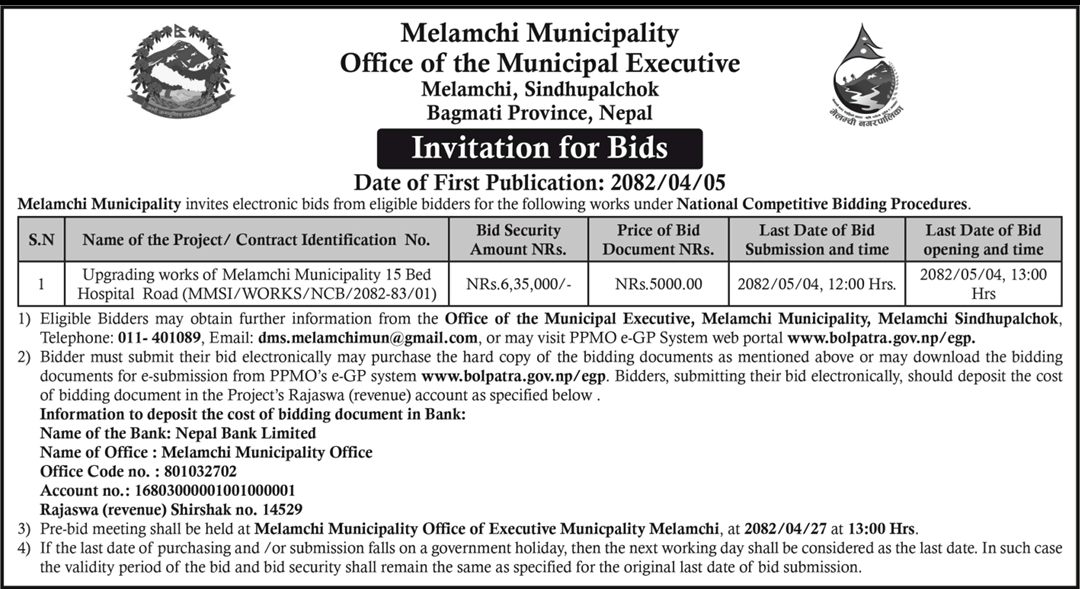 Invitation for Bids (upgrading work of Melamchi municipality 15 bed hospital road)