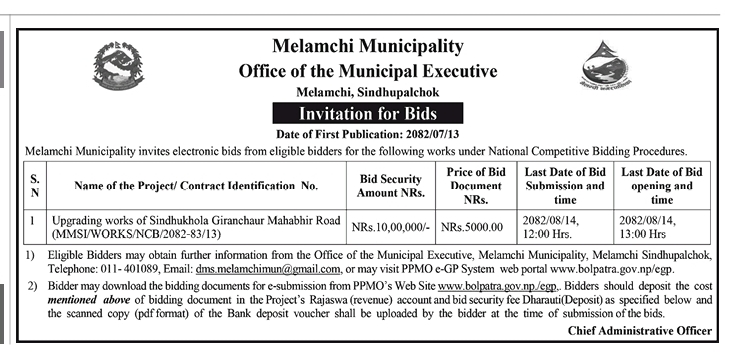 Invitation for bids of upgrading works of Sindhukhola Giranchaur Mahabhir Road
